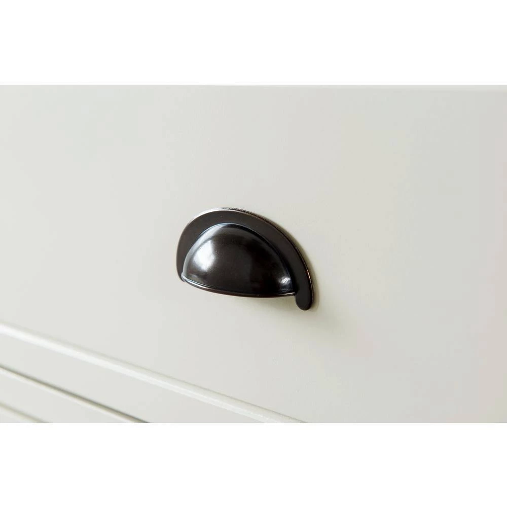 - Dark metal drawer hardware