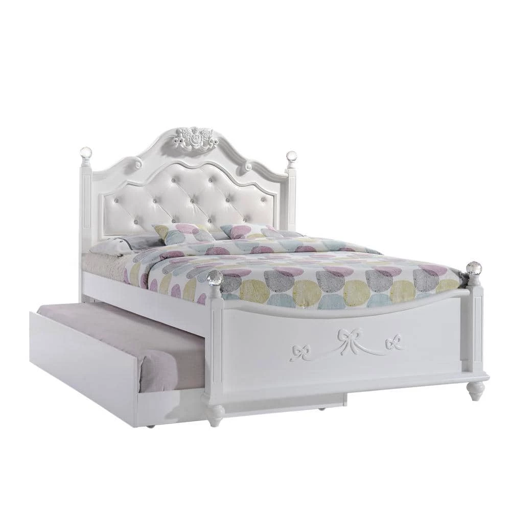 Picket House Furnishings Annie Full Platform 5PC Bedroom with Storage Trundle is what little girl dreams are made of. This group offers a sense of wonder, featuring delicate bow moldings throughout, a button-tufted, white faux leather headboard, and sparkling crystal-ball posts. This well-crafted, beautiful design offers a convenient trundle, keeping your little one organized.