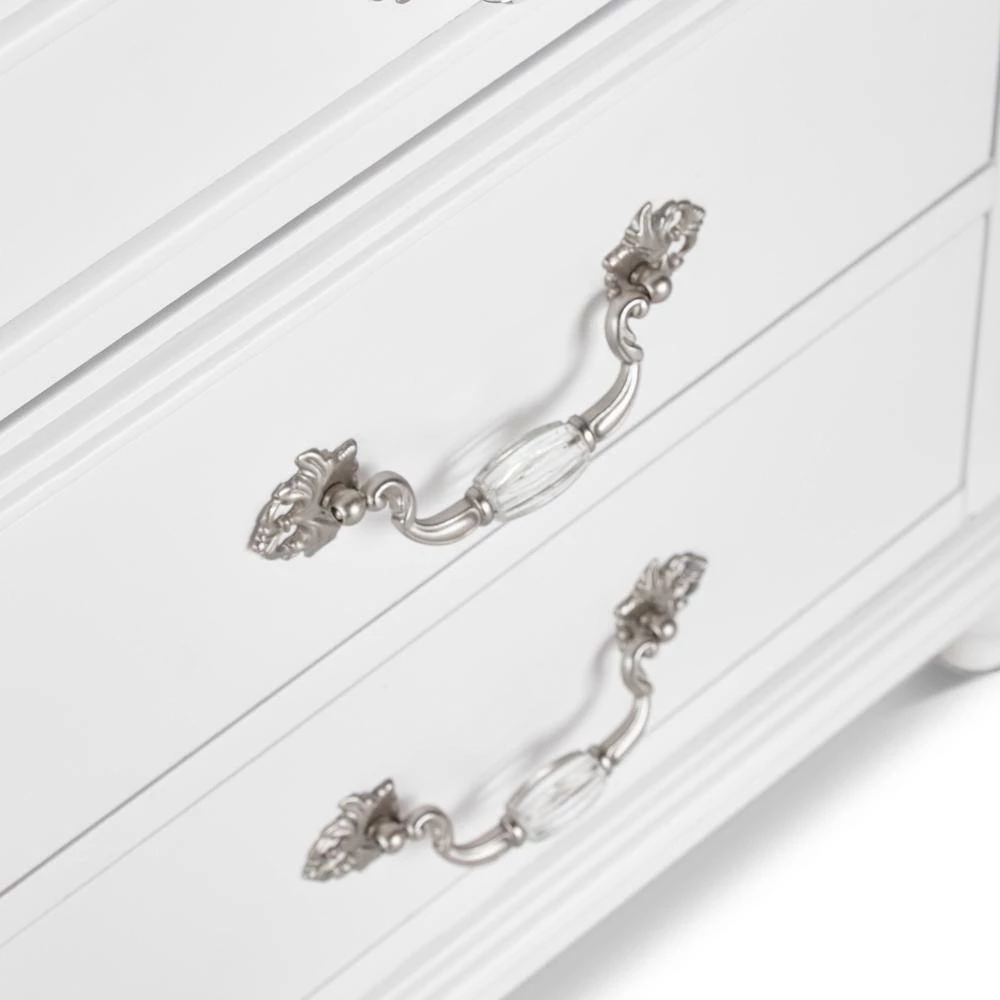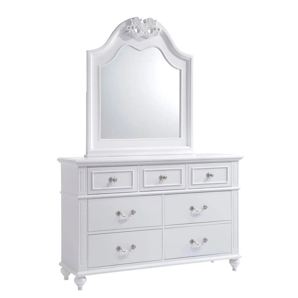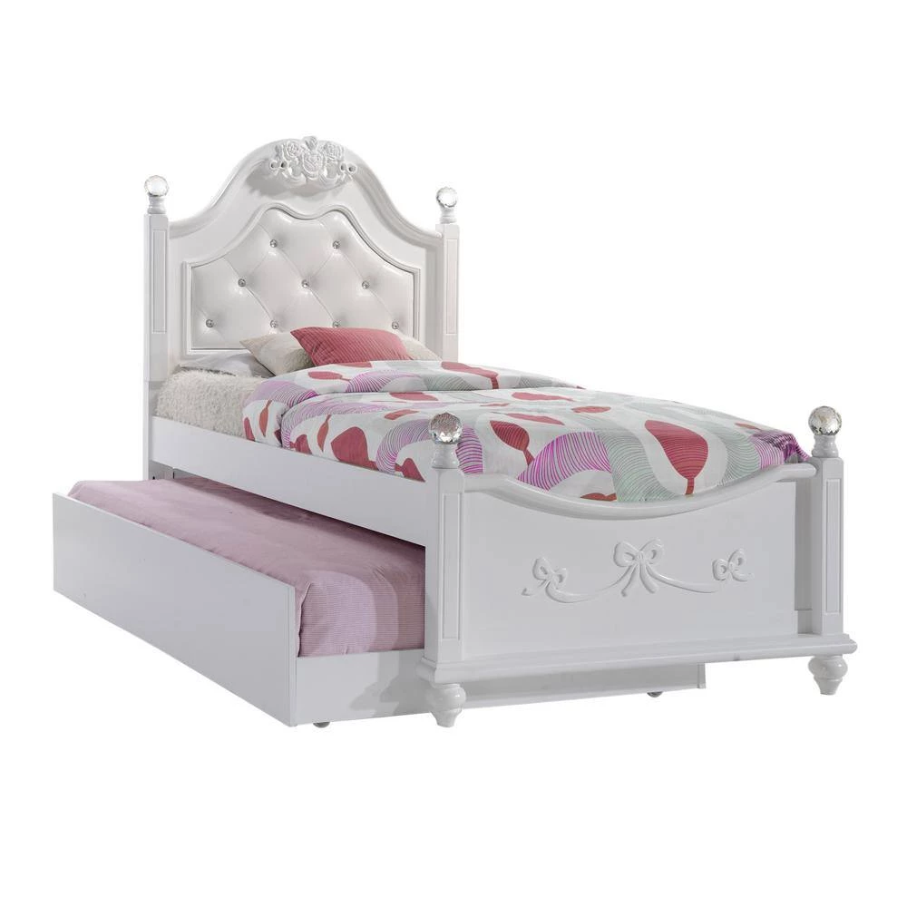 Picket House Furnishings Annie Twin Platform 6PC Bedroom with Storage Trundle is what little girl dreams are made of. This group offers a sense of wonder, featuring delicate bow moldings throughout, a button-tufted, white faux leather headboard, and sparkling crystal-ball posts. This well-crafted, beautiful design offers a convenient trundle, keeping your little one organized.
