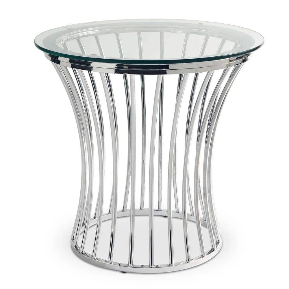 The Picket House Furnishings Astoria Round End Table is the accent piece your living space has been missing, This end table features a modern glam design, instantly adding a dash of luxury to your home. The glass table top pairs perfectly with the chrome finish, making this end table easily transitional with any space. The intricate work on the table base adds an element of drama and flair. This living room staple is perfect for small space living thanks to its tall and narrow design. Add this end table to your living space today for an ultra glam look.