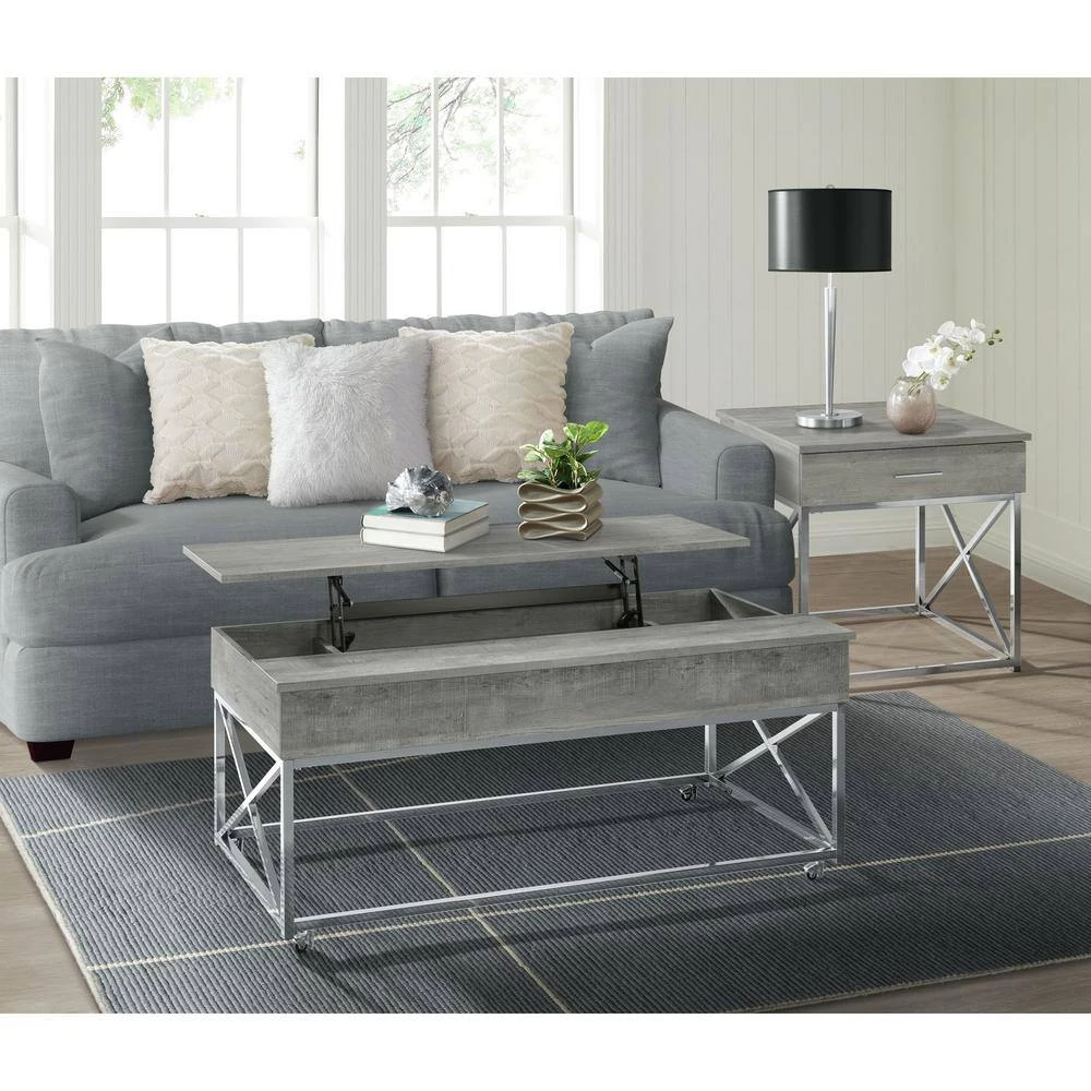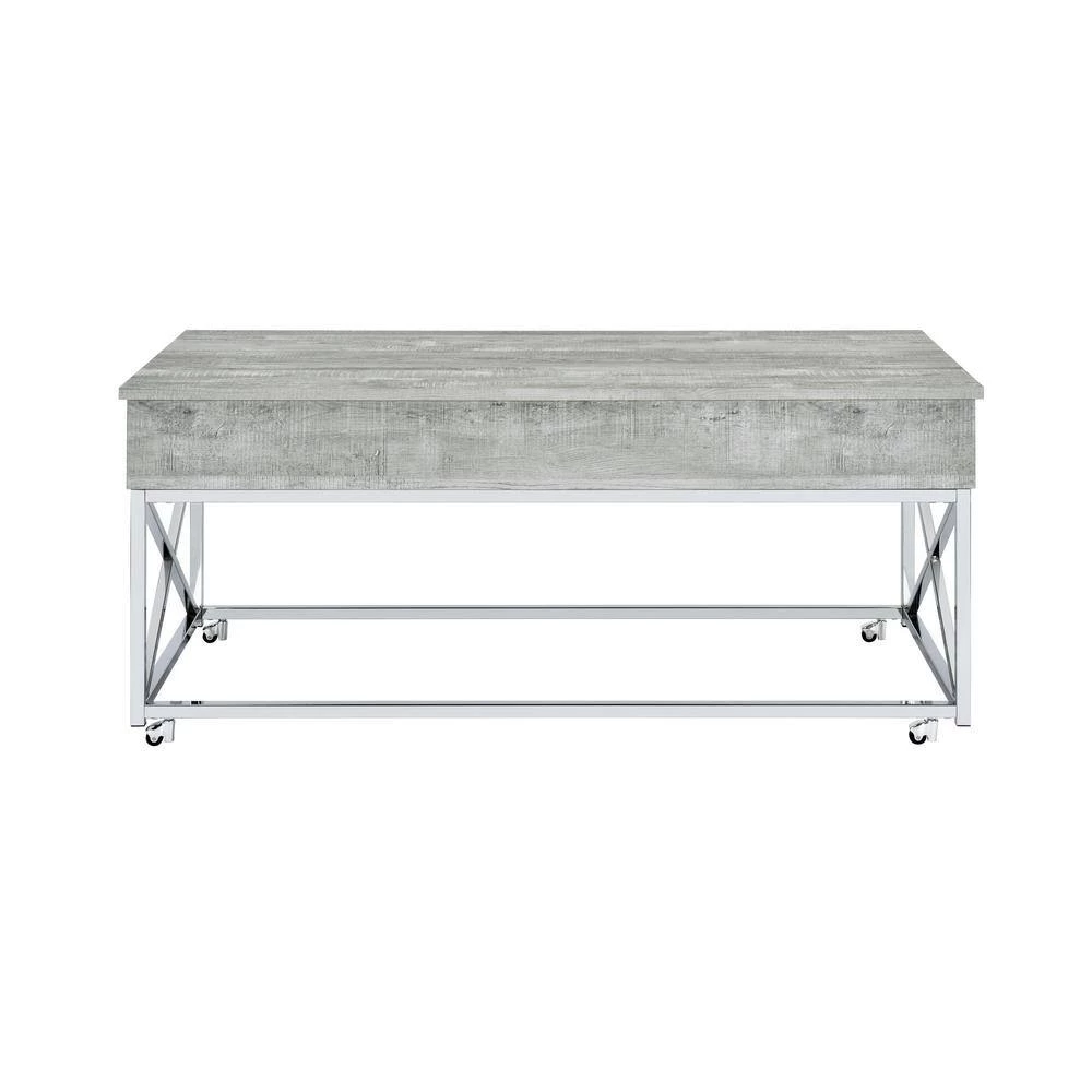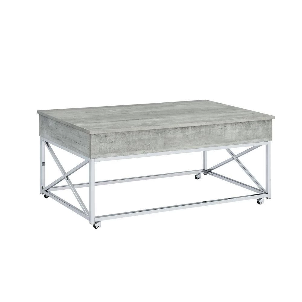 The Picket House Furnishings Eliott Lift Top Coffee Table boasts the kind of convivence and style your living room needs. Featuring a weathered wood grain table top and a shining chrome base. The combination of the chrome and wood creates a cohesive look perfect for contemporary home styles. Raise the top to reveal extra storage, perfect for remotes or magazines. The table is sat atop four metal casters which makes it easier for mobility. The versatility of the Eliot coffee table makes it practical for everyday lounging, eating, or working from the comfort of your living room.