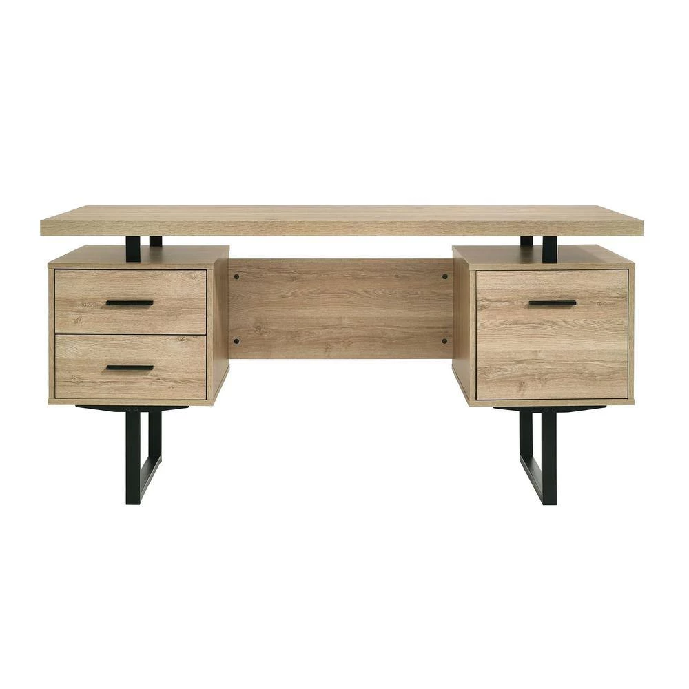 Picket House Furnishings Elwood Desk in Oak is the perfect combination of style and function. With an oak wood look and set on a sturdy black metal base. Features a unique floating top and three drawers that can be used to store all of your essential office supplies. This desk adds a sophisticated and modern touch to a industrial design. Ships in one easy to handle box!