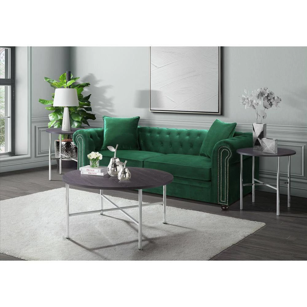 Picket House Furnishings Enzo 3PC Occasional Table Set is the perfect addition to your living room. This set includes, one coffee table and two end tables. The coffee table and end tables mirror each other in construction. 3D paper covers each table top and is designed with a dark charcoal wood appearance. The cool, cross design metal base is coated in a chrome finish making it easy to pair with any of your existing furnishings. The best part of this set is that it ships in one box for amazing convenience.