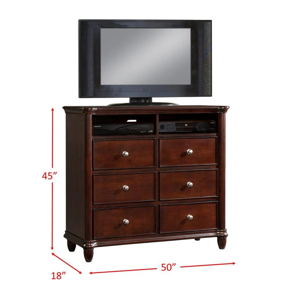 The Picket House Furnishings Gavin 6-Drawer Media Chest is the perfect addition to your home. This TV stand comes with six, spacious drawers; perfect for keeping all of your DVDs or games in one place. Two large media compartments properly store your devices, while the chord control cutouts in the back keep your wires out of sight. Bevel edges and tapered feet elevate the look of this traditional design. Silver round drawer knobs complement the warm, cherry finish beautifully, making it easy to pair with existing decor.