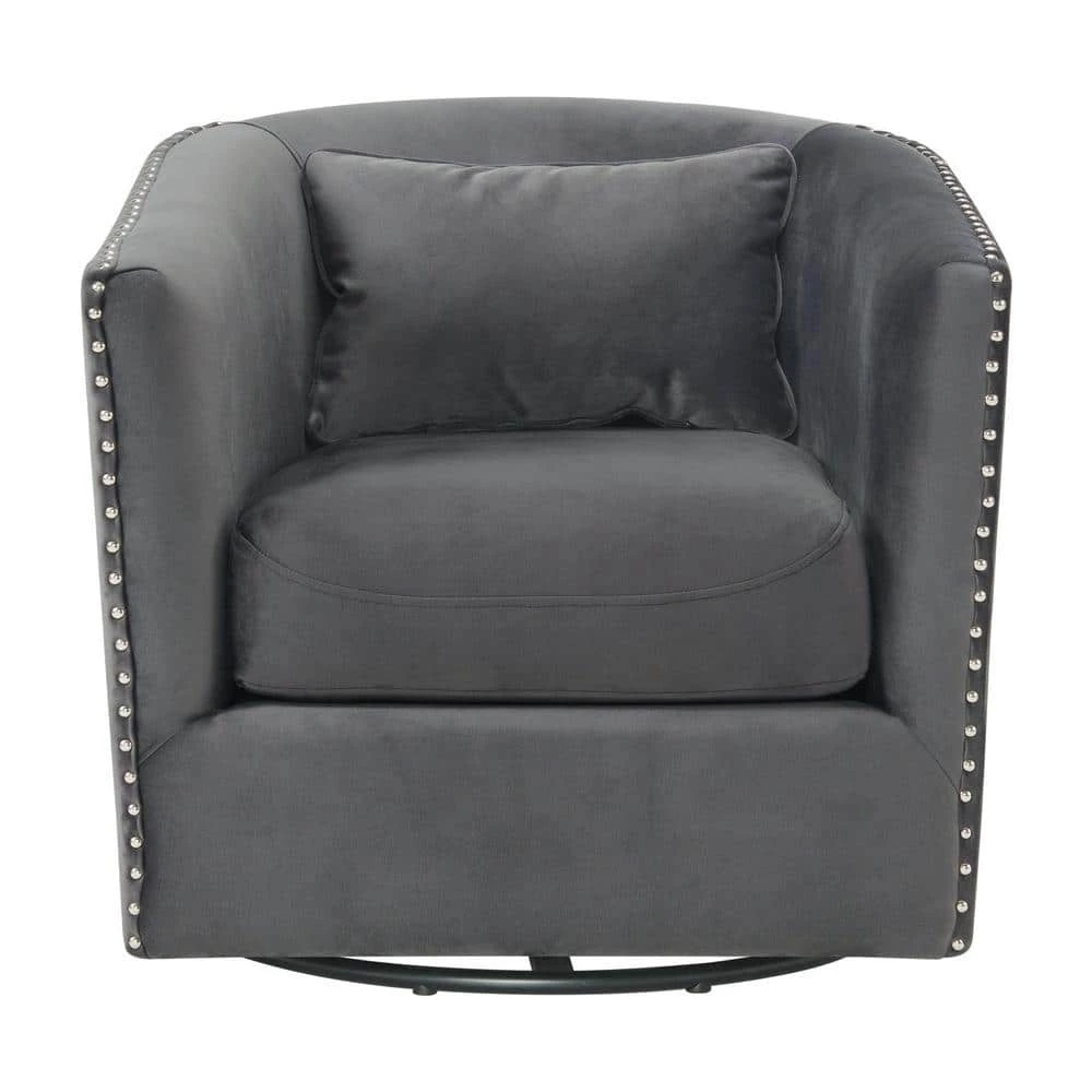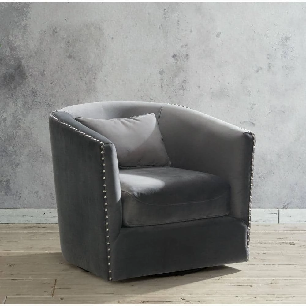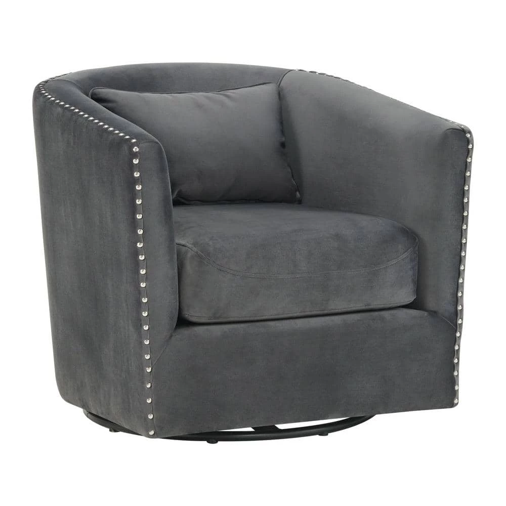 The Picket House Furnishings Zola Swivel Accent Chair is going to be a knockout in your home! This chair features a thick, seat cushion that is super comfy and will have you never wanting to get out of this chair. Chrome, nail head trim is outlined along the edges of the chair, instantly adding extra flair to this already stylish piece. The chair also comes with one pillow that matches the transitional colors that the chair comes in. Add this swivel accent piece to your home today for a look that will never go out of style!