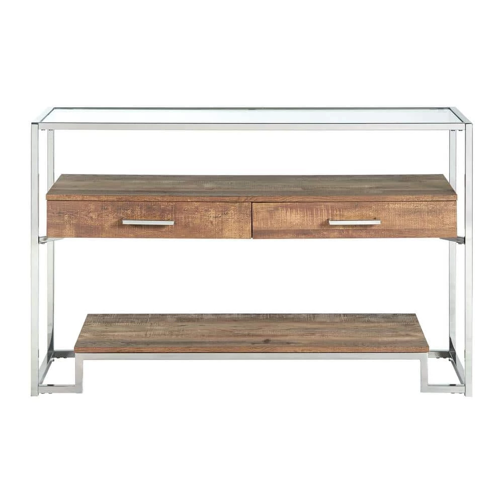 The Picket House Furnishings Hampton Rectangle Storage Sofa Table will look simply stunning in your home. This sofa table features a floating like storage drawer instantly adding extra flair to this living room staple. The storage drawer is finished in a light walnut, making it easy to pair with any existing decor. A metal base, coated in a chrome finish also pairs beautifully with the wood finish of the drawer. A single chrome handle on the drawer allows you to access the drawer with ease. This transitional sofa table will easily become your new favorite piece to show off in your home.