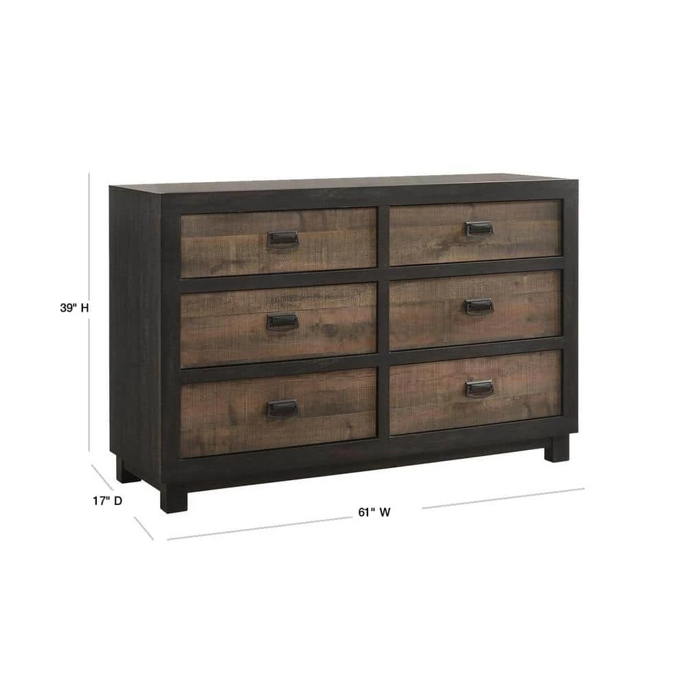 The Picket House Furnishings Harrison 6-Drawer Dresser will add more than just function to your bedroom. This bedroom dresser comes with six, large spacious drawers, perfect for keeping all of your belongings neatly stored away. The top drawers are felt lined, which means you can store your more delicate belongings without worry. The bottom drawers features a dust proofing layer to help protect your belongings. The unique finish on this dresser is very striking with the framing in a dark chocolate color, while the drawer fronts are a complementary lighter finish. Completing the look are the dark nickel drawer pulls and square feet.