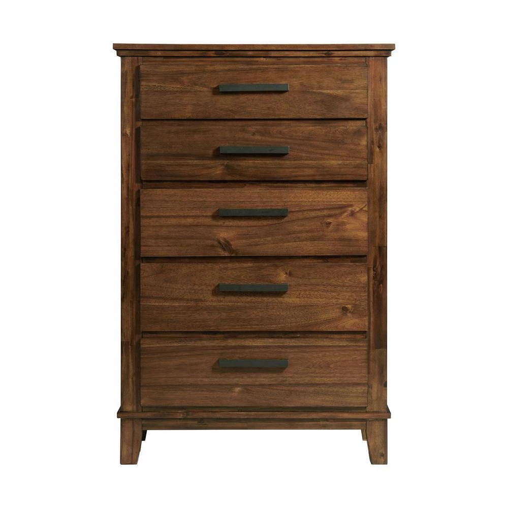 The Picket House Furnishings Jaxon 5-Drawer Chest delivers storage and style. Constructed of solid and manufactured woods with natural wood grain detailing throughout. Accented by the black metal drawer pulls, the drawers have ball bearing glides for easy access to your clothing. Perfect addition to modern or contemporary styled homes.