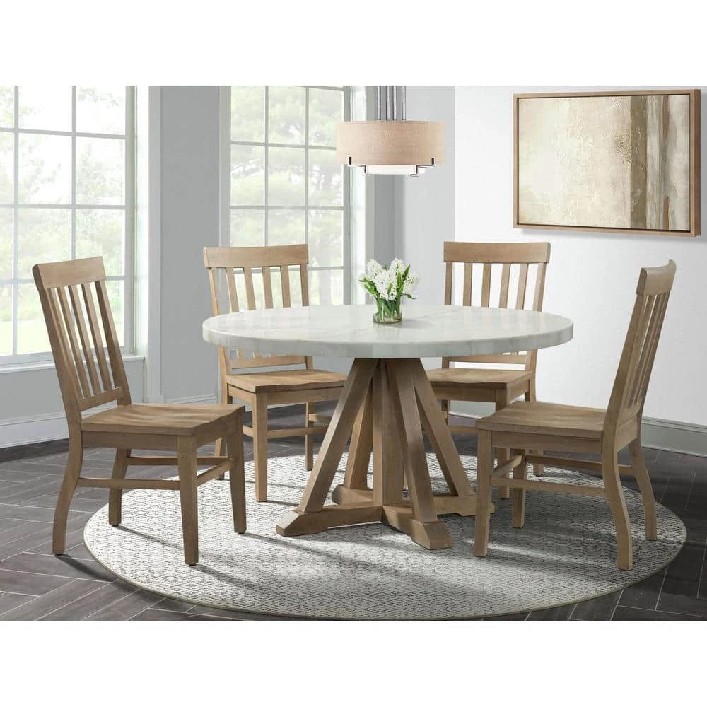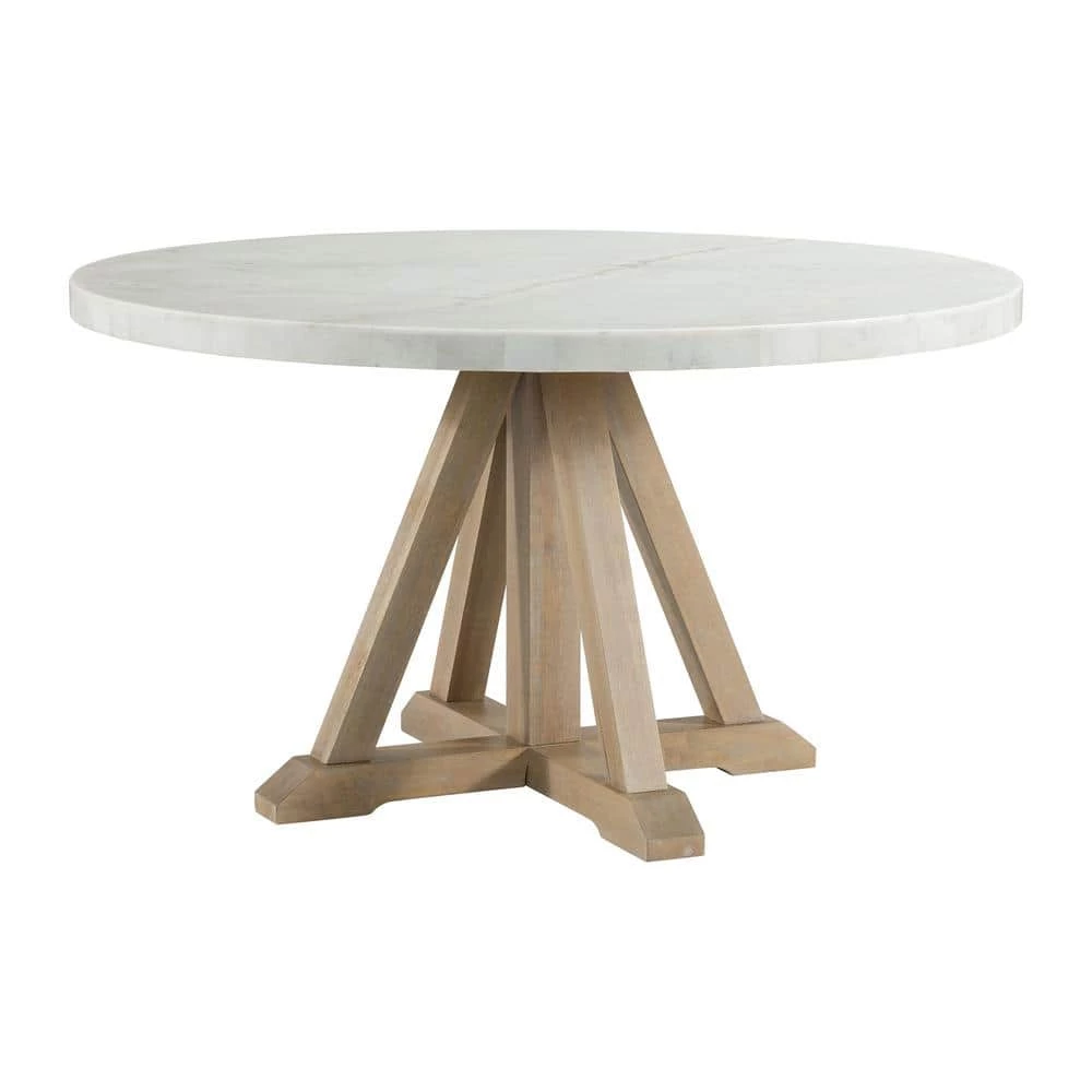 The Picket House Furnishings Liam Round Dining Table will look marvelous in your home. This table features, a white marble top and a natural finish base. The white, marble table top details light veining with subtle grey tones. The table top transitions beautifully into the natural wood finish base. Also, the pedestal base provides full stability for the marble top. If you are looking to complete this table, check out the slat back chair in this collection.