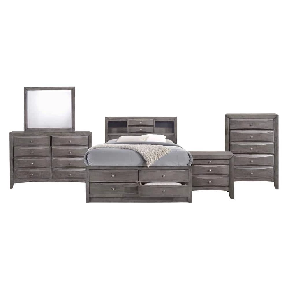 The Picket House Furnishings Madison Queen Storage 5-Piece Bedroom Set will keep you organized. Its contemporary, contoured drawers give it a custom look. Plenty of storage is provided throughout all case pieces as well as on all sides of the bed. This set is sure to add functionality and beauty to any room.