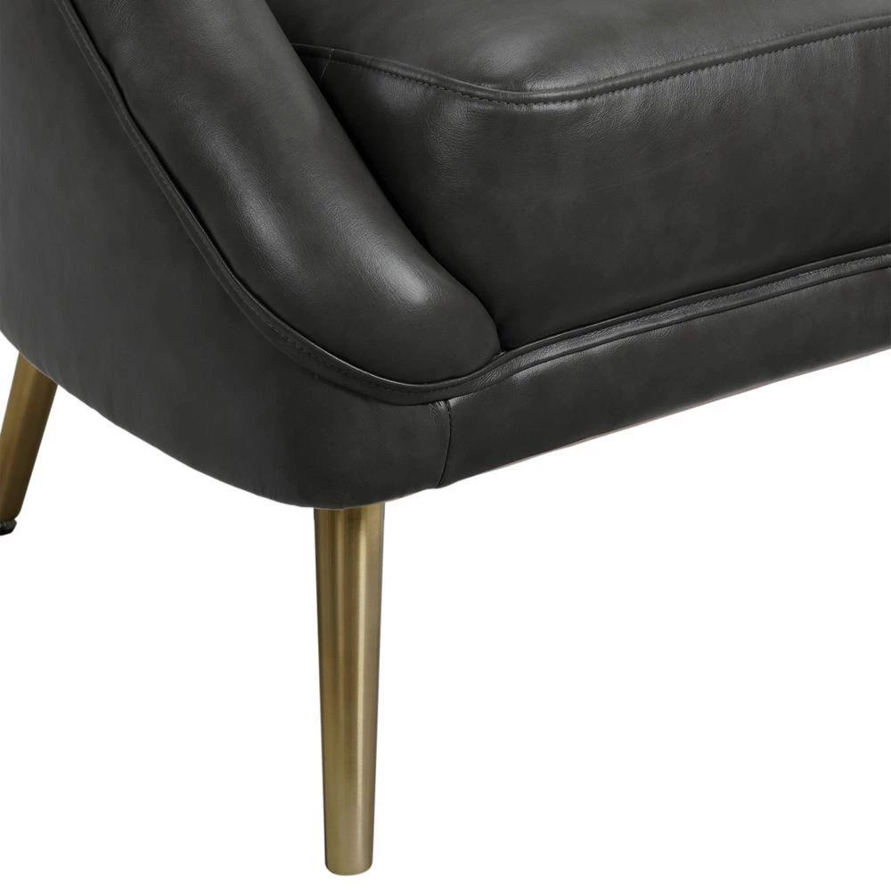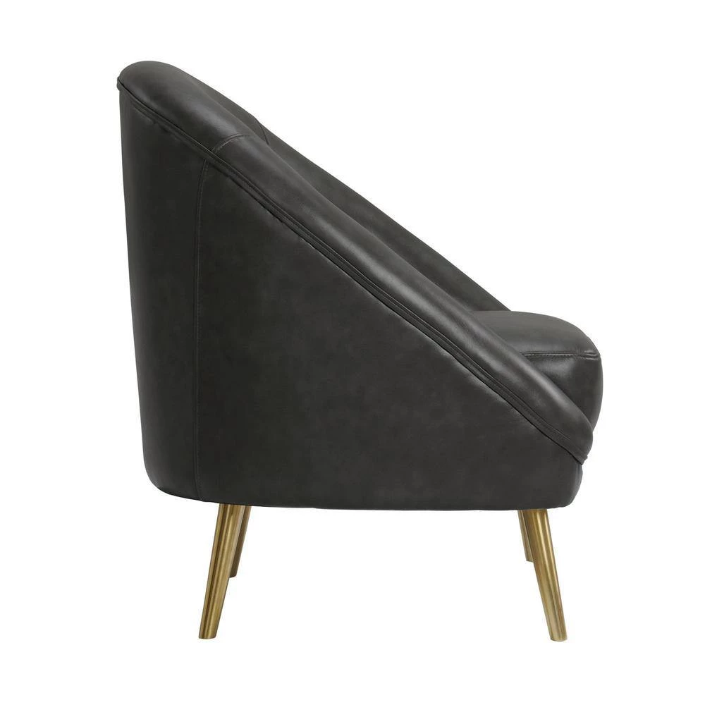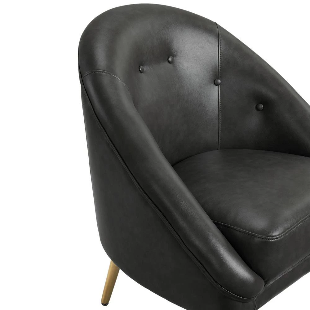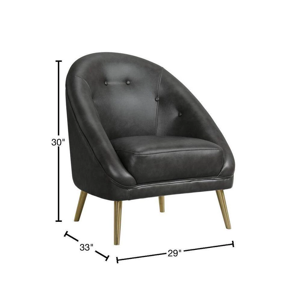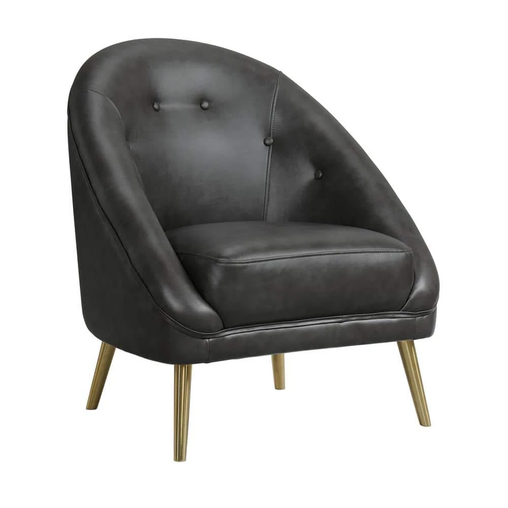 The Picket House Furnishings Taya Accent Chair is the perfect addition to your home. This chair will add instant glamour to your living room. Upholstered in faux leather fabric and constructed in solid rubberwood and plywood. Featuring beautiful deep button tufting and a curved silhouette. Foam cushioning for all day enhanced comfort. Set on trendy, tapered gold metal legs. Complete the look of your home with the Taya Chair.