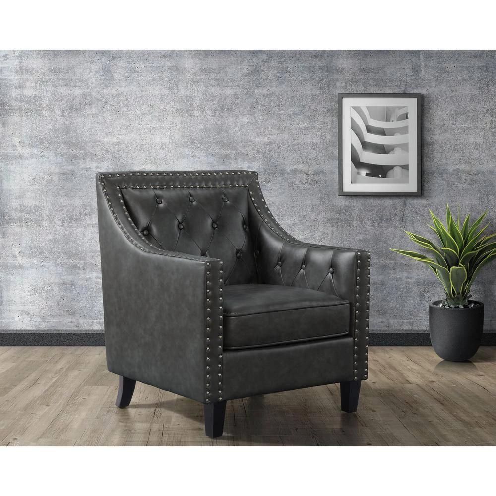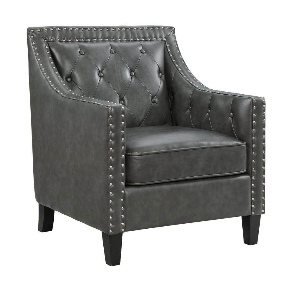 The Picket House Furnishings Tessa Accent Chair is the piece you’ve been missing. This chair is perfect for your modern home aesthetics. Crafted in plywood, rubberwood, and upholstered in soft faux leather fabric. Adds an interesting touch with its silver nail head trim and diamond tufting at back. Add the Tessa accent chair to your home for a modern touch.
