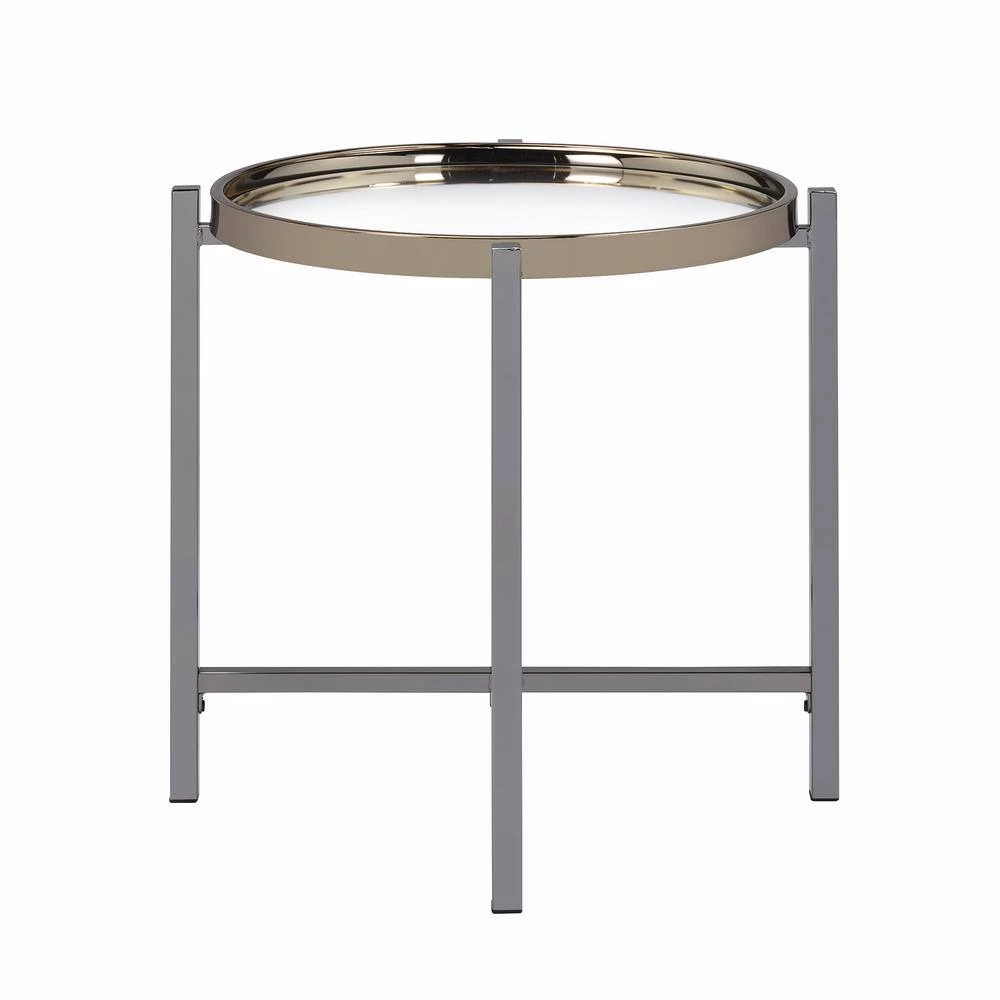 The Picket House Furnishings Monaco 2PC Occasional Table Set is the perfect addition to your home! This duo comes with a coffee table and end table, creating the ideal living space. This set features a mirrored table top, that is also tray like. The table top edge is finished in a gold, while the legs are in a dark nickel. The bottom shelf on the coffee table is perfect for storing away any books and magazines, or it can easily be used to display your favorite decor. The end tables base features stretchers to provide extra stability, without losing style. Add this duo to your home today!
