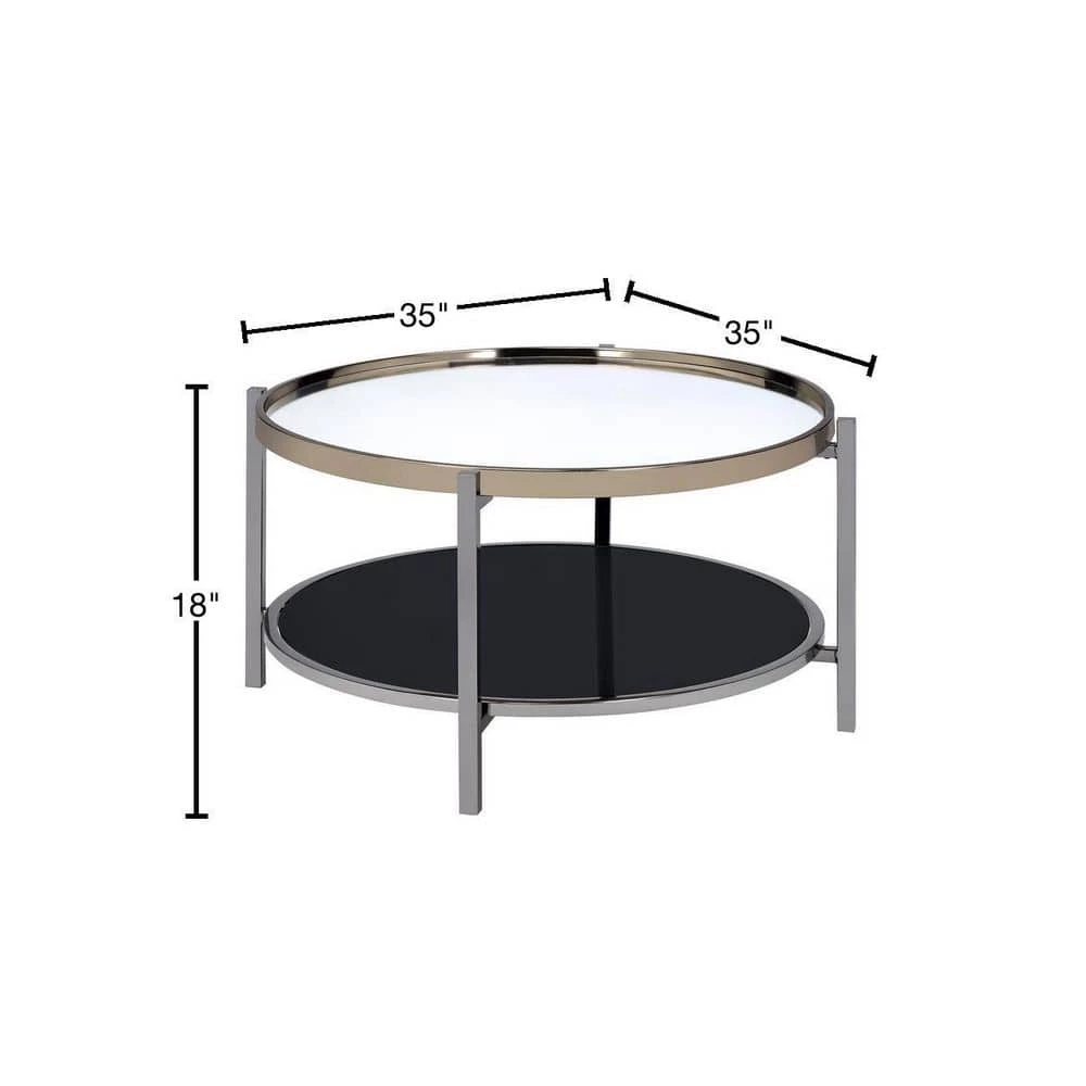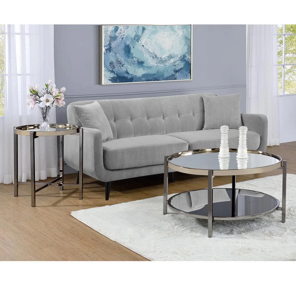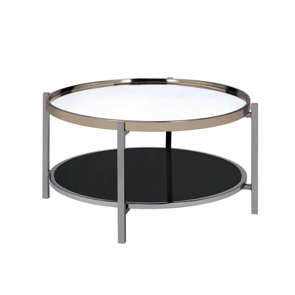 The Picket House Furnishings Monaco Round Coffee Table is the perfect addition to your home! This coffee table features a mirrored table top, that is also tray like; so everything will stay on the table and not fall off! The table top edge is finished in a gold, while the legs are in a dark nickel. The bottom shelf is perfect for storing away any books and magazines, or it can easily be used to display your favorite decor. This coffee table is super stylish and ideal for small space living!