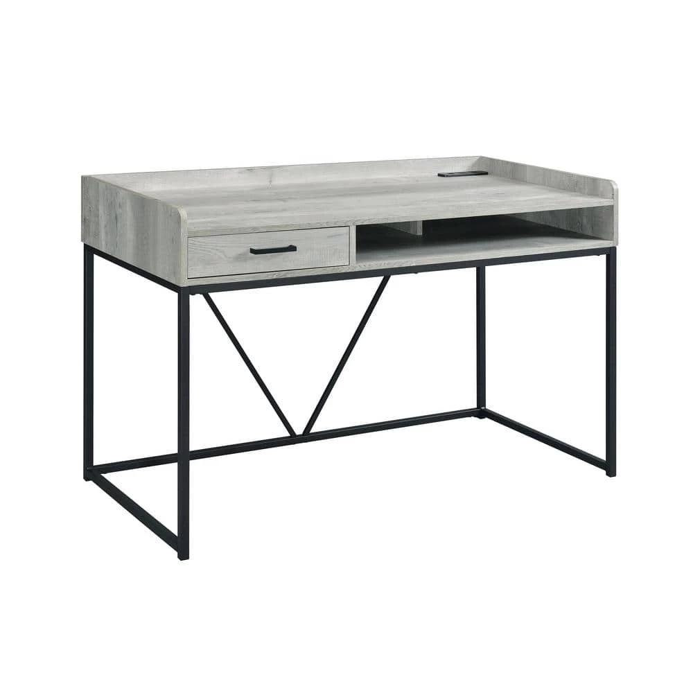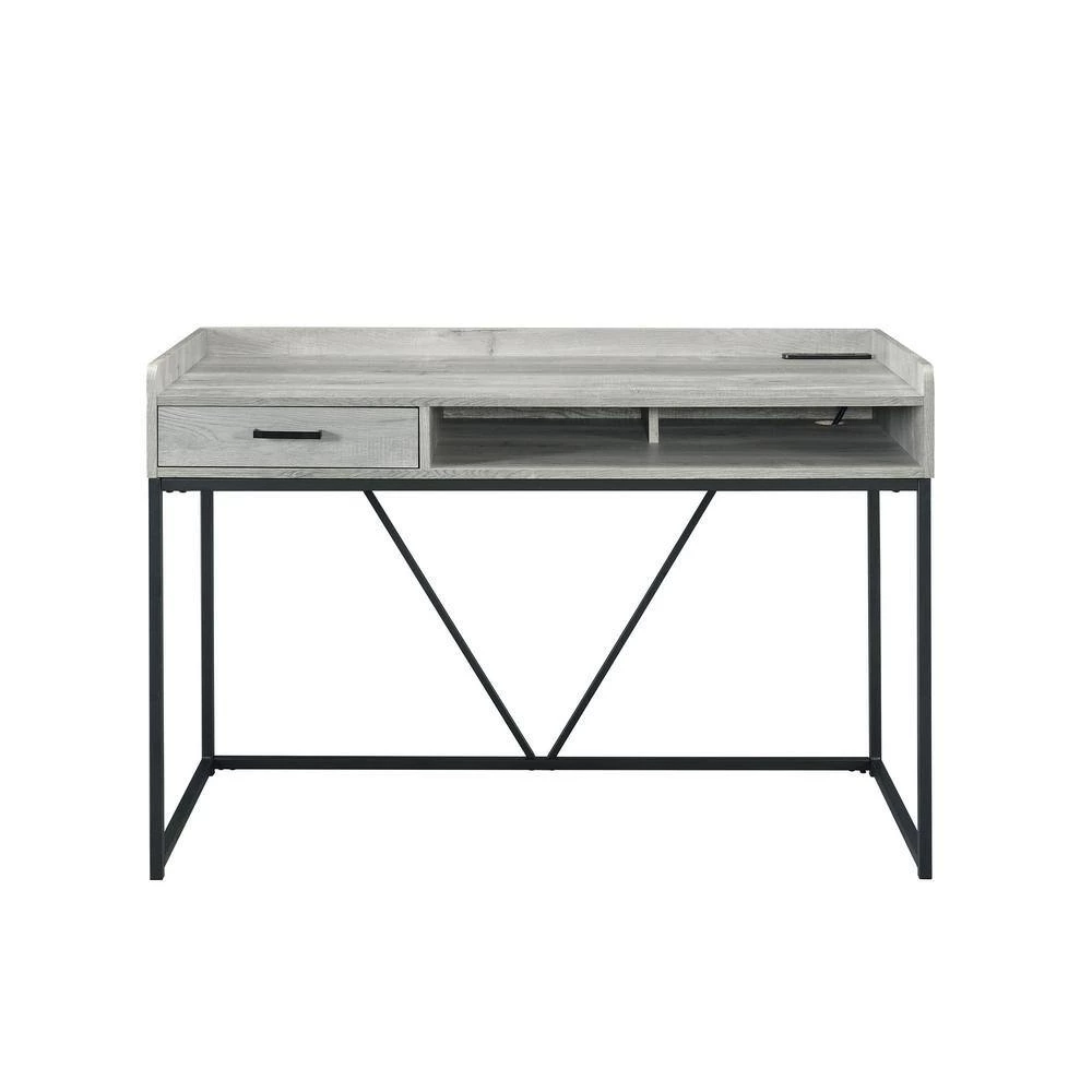 The Picket House Furnishings Peyton Desk provides plenty of functionality and style. With one spacious drawer and two open storage compartments, the Peyton provides ample storage for storing your favorite books. Constructed of sturdy wood and metal with a V-shaped back design. Black metal secure drawer pull adds textural element to this industrial desk. Includes one power outlet for keeping all of your devices charged. Features woodgrain detailing for a rustic finish. The vintage, industrial design is perfect for your home office or living room.
