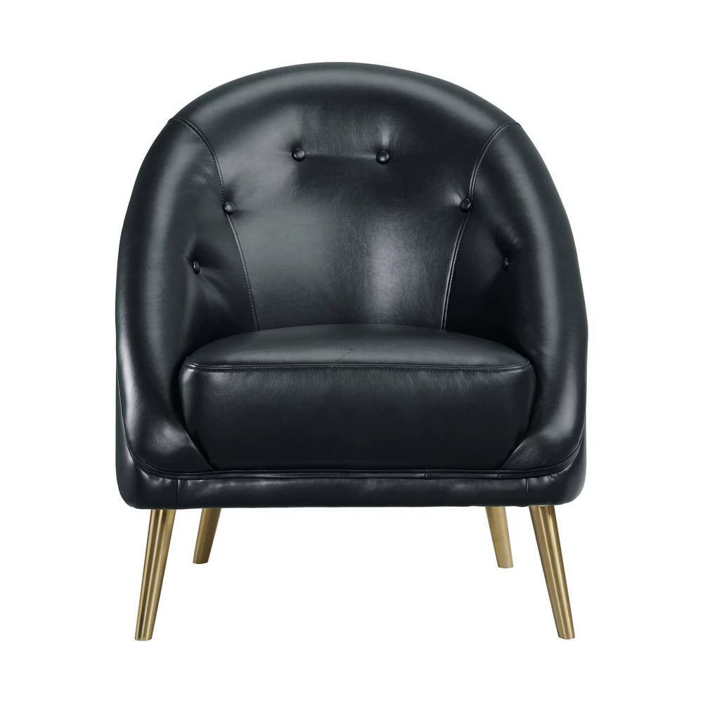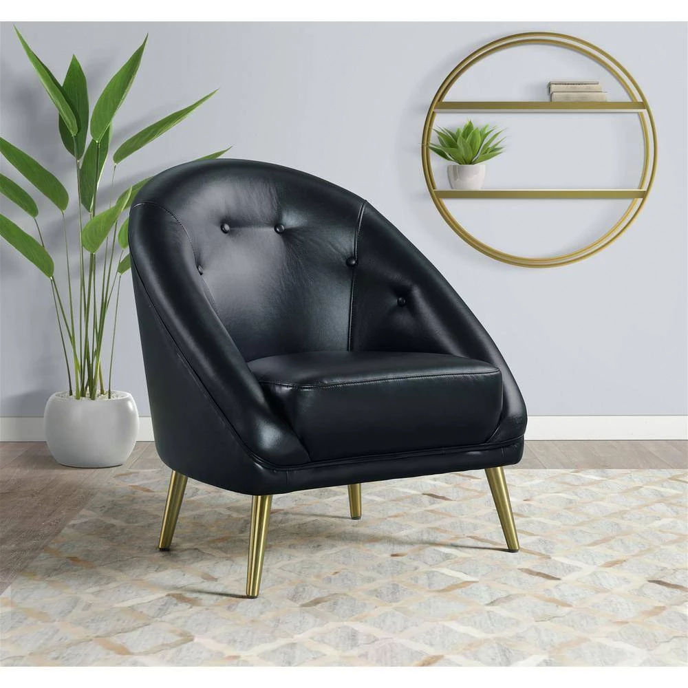 The Picket House Furnishings Taya Accent Chair is the perfect addition to your home. This chair will add instant glamour to your living room. Upholstered in faux leather and constructed in solid rubberwood and plywood. Featuring beautiful deep button tufting and a curved silhouette. Foam cushioning for all day enhanced comfort. Set on trendy, tapered gold metal legs. Complete the look of your home with the Taya Chair.