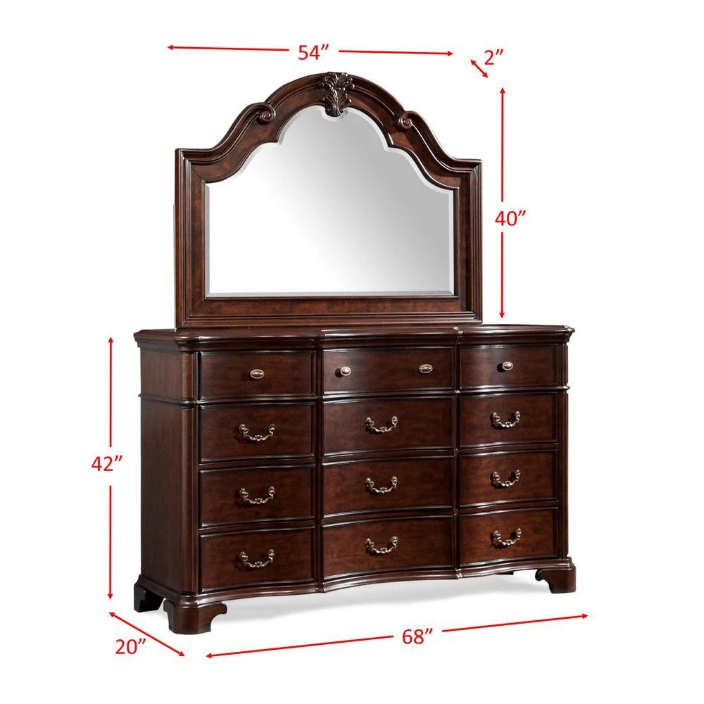 The picket house furnishings tomlyn 12-drawer dresser and mirror set is the perfect addition to your bedroom. This traditional dresser comes with twelve, spacious drawers; perfect for finding a spot to store away all of your belongings. The drawer fronts are curved, adding an extra element of design to this stylish set. The landscape mirror features bevel edges and intricate moldings throughout. Antique brass drawer pulls and knobs complement the dark, cherry finish beautifully.