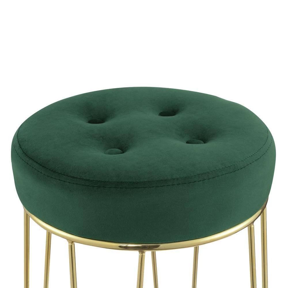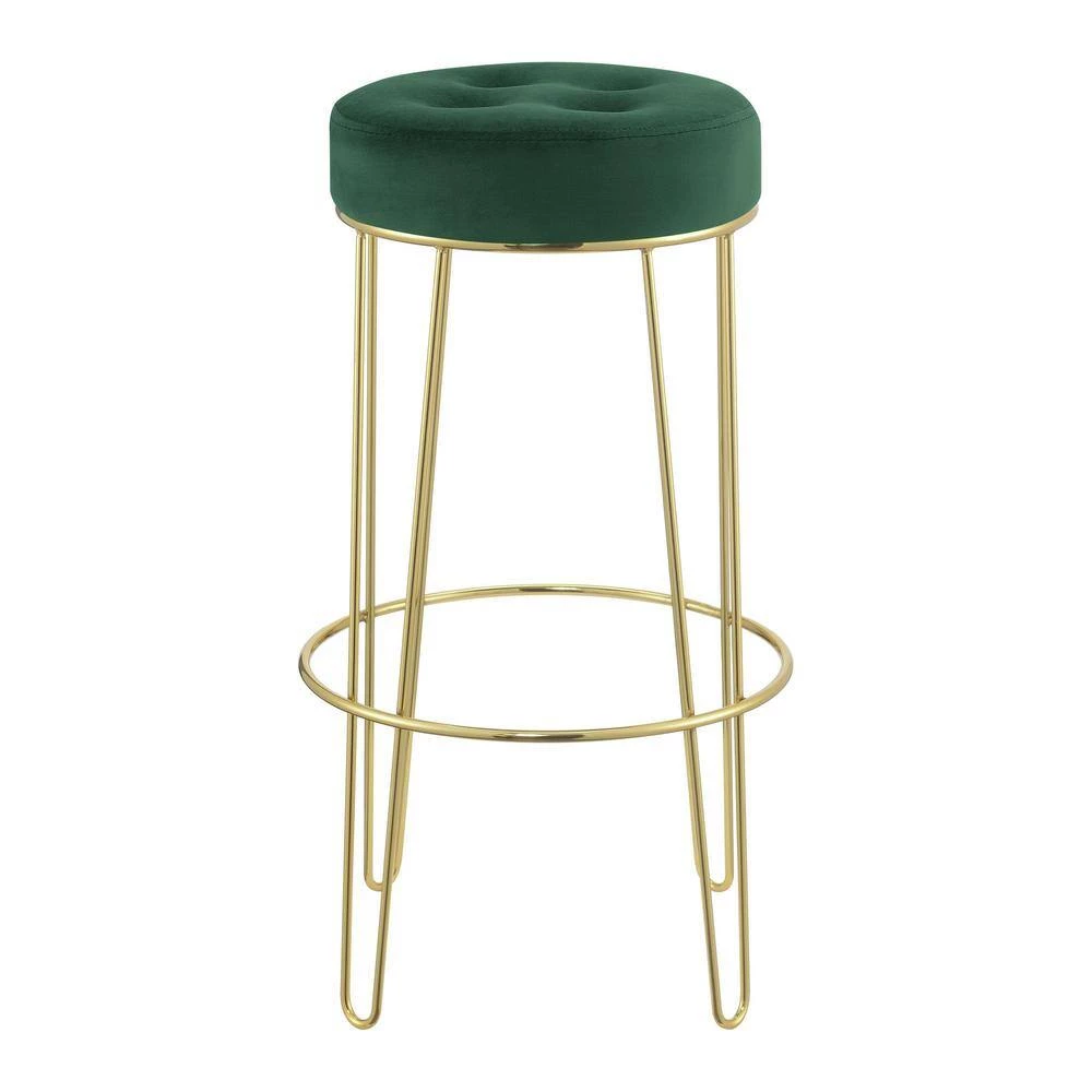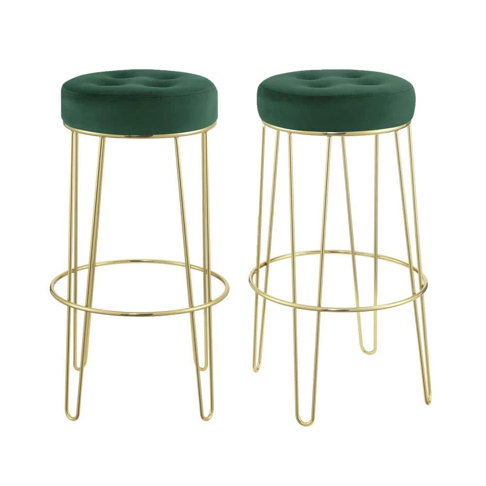 The Picket House Furnishings Vera Bar Stool effortlessly elevates the vibe of your interior decor with its swank and rich color choice. The rounded seats are upholstery in soft, luxurious velvet and enhanced with plush foam cushioning. Situated atop a trendy gold metal frame featuring 4 hairpin legs. The combination of the tufted upholstery and gold hairpin legs adds a glamorous visual touch. Ideal for your dining room, home bar, or kitchen.